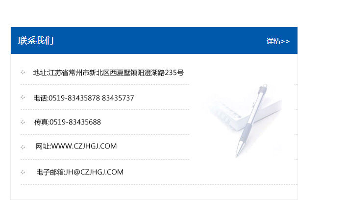 傳真:0519-83435688    郵編:213135    網址:WWW.czjhgj_com.assrtool.com    電子郵箱:JH@czjhgj_com.assrtool.com